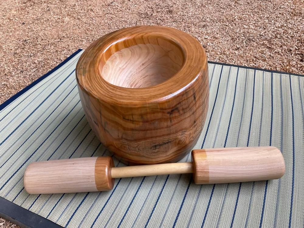 臼のふちに杵(きね)が当たったとき、臼のふちがかけて木片がもちに混入することがあります。ケヤキは粘りのある木なので、そんな欠けが起こりにくい材です。